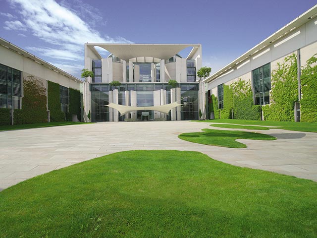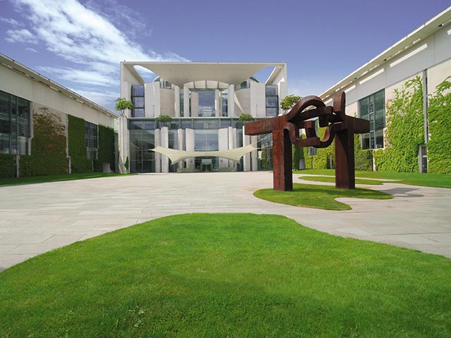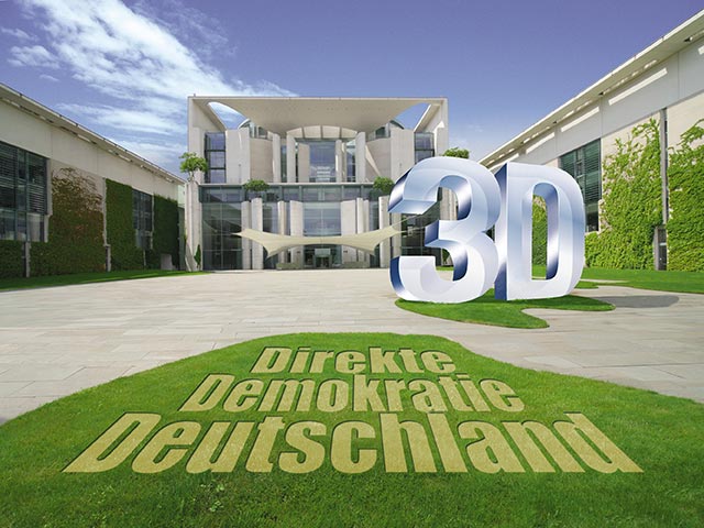 Wenn nun die Frage gestellt wird: Wer entscheidet eigentlich über die Nationalhymne? – zeigt sich überraschend im Vorgarten des Bundeskanzleramtes eine virtuelle 3D-Skulptur. Und der grüne Rasen gibt uns den Hinweis: „Direkte Demokratie für Deutschland“.